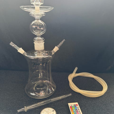 IKEA vandpibe med dekorativt ophæng og glasdetaljer. Vandpiben har en slank base med mønster og en slange til tilslutning. Øverste del har metalbakke til kul og hoved til tobak. Egnet som brugsting eller som dekorativ genstand i hjemmet.