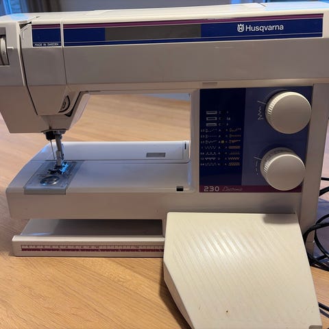 Husqvarna Viking 335 symaskine med mekanisk betjening. Maskinen har indbyggede nyttesømme og dekorative sømme, som kan vælges via drejeknapper på fronten. Der er indbygget arbejdslys ved nålen og aftagelig tilbehørsboks med opbevaring til spoler og trykfødder. Maskinen leveres med fodpedal og flere forskellige trykfødder samt spoler, som kan ses på billederne. Velegnet til almindelig syning, oplægning, reparationer og simple kreative syprojekter i forskellige stoftyper.