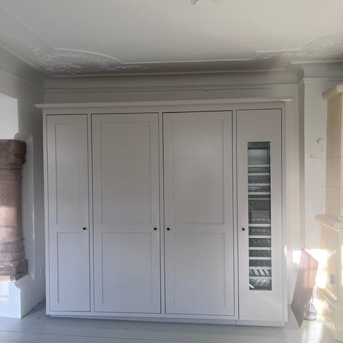 • Skabsvæg ca. 263 cm med skabe, egetræsskuffer og vinkøleskab