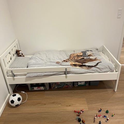 IKEA juniorseng i hvid. Sengen er i træ og har sengehest på siderne, som giver ekstra sikkerhed til barnet. Velegnet som overgangsseng mellem tremmeseng og almindelig seng. Passer til standard junior-madrasstørrelse (ikke inkluderet, hvis ikke andet er angivet i annoncen). Klassisk, enkel stil der passer ind på de fleste børneværelser.