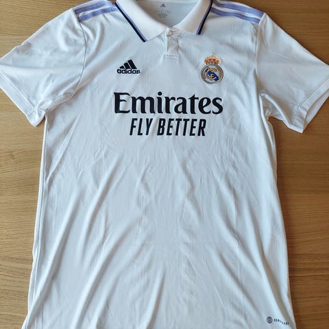 Adidas Real Madrid fodboldsæt i hvid. Sættet består af trøje og shorts med Real Madrid-klublogo, Adidas-logo samt sponsortryk. Materialet er let og egnet til fodbold og anden sport. Farven er klassisk hvid med mørke detaljer og klubmærker på både trøje og shorts.