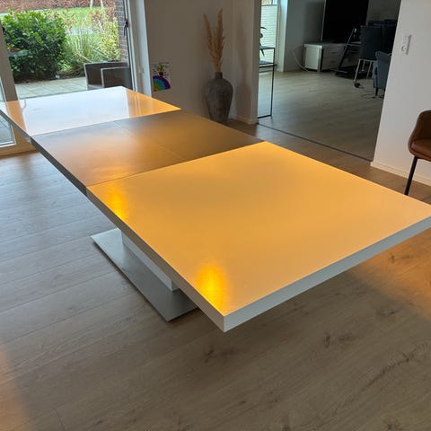 Bordpladerne kan trækkes fra hinanden og så gemmer der sig forlænger plader som gør bordet 50 cm længere. Rigtig fin stand :)