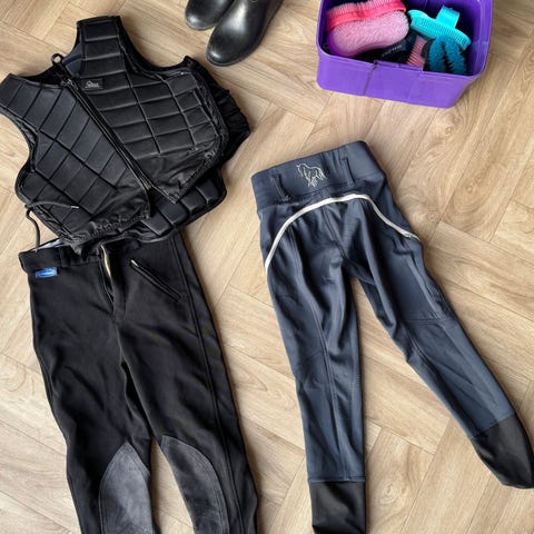 Ridestøvler str. 33, ridehjelm str. 55, 2 ridebukser i str. 128 og 150, 2 fleece bluser, en fleece vest, 3 jakker i str. ca. 7 år og op til 10 år, ridehandsker, ridepisk og sikkerhedsvest. Alt hvad den nye børnerytter har brug for.
