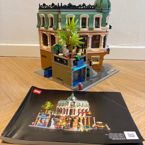 LEGO Icons Boutique Hotel byggesæt. Sættet forestiller et hjørnebygget hotel i flere etager med detaljeret facade, kuppel og tagterrasse. Modellen omfatter blandt andet reception, værelser, kunstgalleri og tilhørende bymiljø med trapper, palme og små boder. Indeholder flere minifigurer og tilbehør, der kan bruges til at skabe forskellige byscenarier og indrette hotellets indre og omgivelser. Velegnet som samlersæt og til opbygning af en modulopbygget by i LEGO Icons serien.