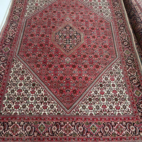 Maskinvævet iransk tæppe i i mørkeblå, creme og rød