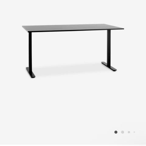 Skrivebord i sort med hjørneformet bordplade. Bordet har rektangulær plade med udskæring i den ene side, som giver ekstra plads til arbejde eller computerudstyr. Overfladen har træstruktur, og bordet står på to ben med rektangulære fødder, der giver stabilitet. Velegnet som arbejds- eller computerbord i hjemmekontor eller stue.