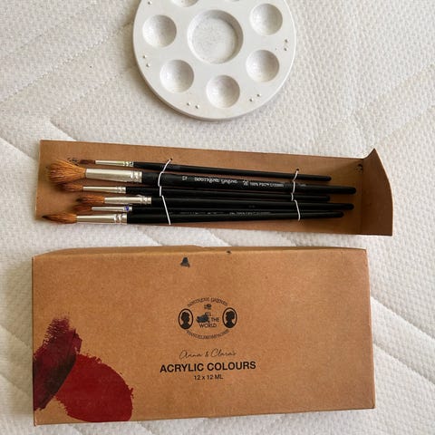 akrylfarver sæt i flere farver. Sættet består af flere tuber akrylmaling i forskellige nuancer, egnet til maling på lærred, papir og andre egnede overflader. Leveres i en gennemsigtig plastkasse med låg for opbevaring og transport.