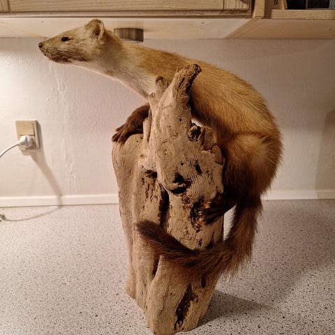 Flot husmår skind sælges. Skindet måler ca. 86 cm fra snudespids til halespids.