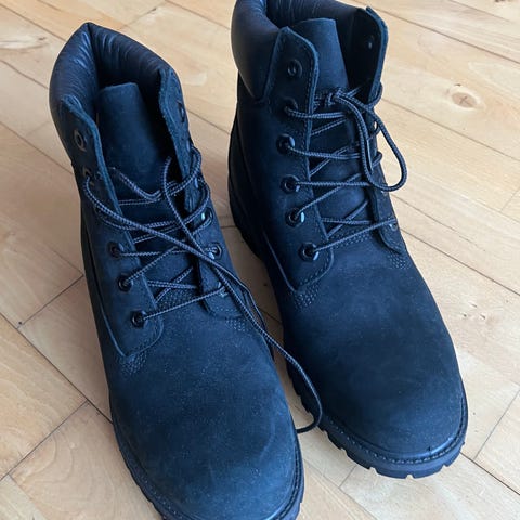 Timberland støvler i størrelse 39. Klassiske snørestøvler i sort med kraftig, mønstret gummisål og polstret skaftkant. Indvendig for i syntetisk materiale og læder-look ved indersålen. Velegnet som hverdagssko eller til udendørs brug i køligere vejr.