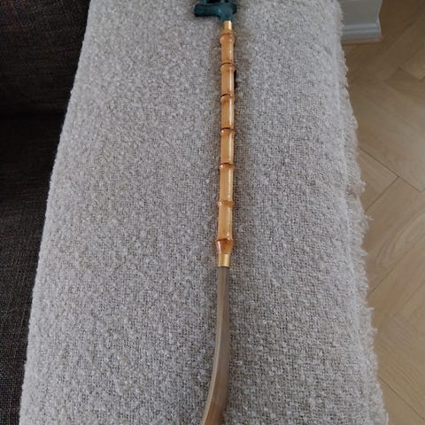 Skomedhjælp skohorn med udskåret træskaft og grøn plast-ende. Skohornet har et langt skaft, der gør det nemmere at tage sko på uden at bøje sig så meget ned. Træskaftet er drejet og udformet med dekorative detaljer, og øverst er der en glat skohorn-del i plast. Egnet til daglig brug i entré eller garderobe.