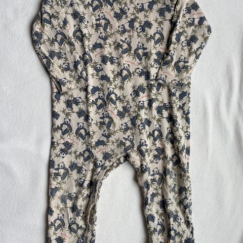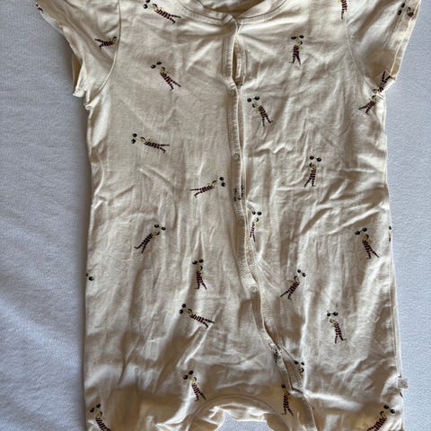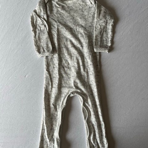 Konges Sløjd blød heldragt i printet Brown Lemon i størrelse 80. Den har fået en misfarvning på det ene ben (se billede), som jeg ikke ved, hvad er. 95% økologisk bomuld, 5% elastane. Kun vasket i neutral vaskemiddel.