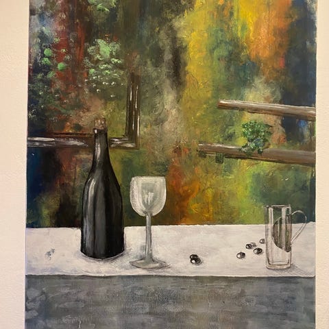 Maleri i flot mørk træramme. Forestiller kander/vaser/stearinlys og morter. Kunstner er vist Henry Home - ikke helt sikker på signaturen. Fra ikke ryger hjem. I fin og perfekt stand.