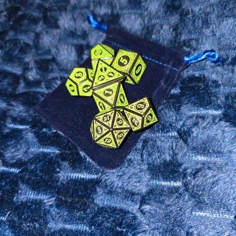 Terningesæt bestående af flere seks-sidede terninger med forskellige monster-motiver og farvede øjne. Egnet som tilbehør til brætspil, rollespil eller andre spil, hvor der ønskes tematiske eller dekorative terninger.