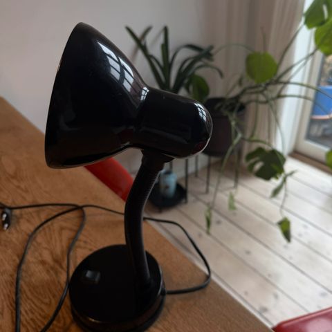 Fin lille bordlampe, med gitter for pæren og bøjelig arm.