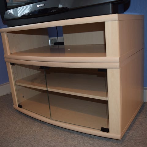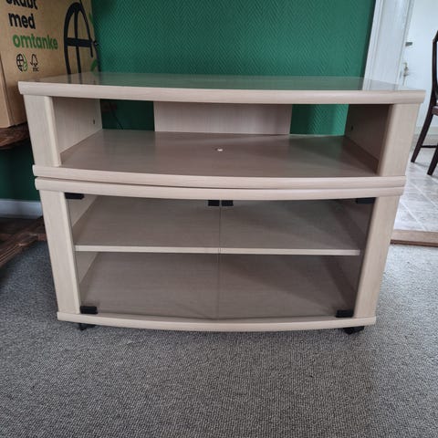 Tv-bord i lys træfarve med rektangulær bordplade og ekstra hylde til fx medieudstyr. Nederst et lukket opbevaringsrum med to glaslåger på fronten. Bordet står på små hjul, så det er let at flytte. Velegnet til tv, dvd-afspiller, spillekonsol eller anden elektronik samt opbevaring af tilbehør bag glaslågerne.