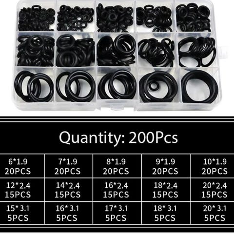 O-ring sortiment sæt med i alt 225 stk sorte nitrilgummi O-ringe. Sættet leveres i plastboks med flere rum, hvor ringene er opdelt efter størrelse. Størrelserne spænder blandt andet over udvendige diametre fra ca. 3 mm til 8 mm med varierende trådtykkelser. Velegnet til tætning i diverse tekniske og mekaniske applikationer, f.eks. VVS, bil, maskiner og husholdningsudstyr, hvor der er behov for forskellige standard O-ringe i nitrilgummi.