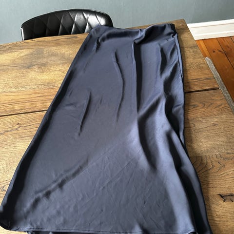 Zara nederdel i sølv til kvinder i størrelse L. Nederdelen er ribstrikket med glitrende tråd i stoffet og har en slids foran. Længden går cirka til midt på læggen, afhængigt af højde. Velegnet til både hverdag og fest afhængigt af styling.