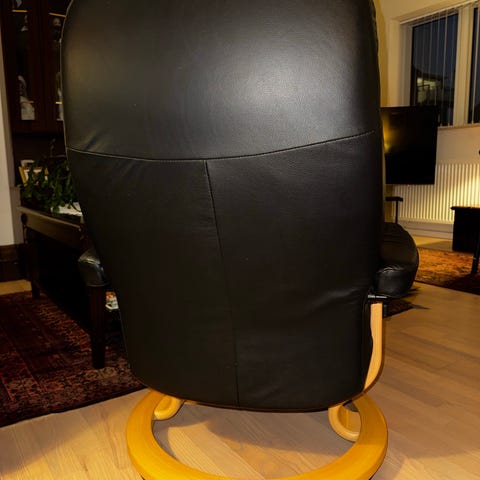 En stresless lænestole med skammel i læder. Den er i pæn stand og kommer fra et ikke ryger og dyrfri hjem. Afhentningspris kr 1500.