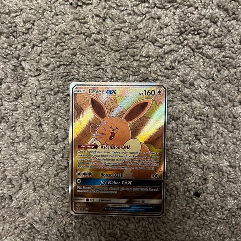 Pokémon Eevee & Snorlax GX samlekort. Kortet viser Pokémon-figurerne Eevee og Snorlax i GX-version med 270 HP. Forsiden har illustration, angrebsnavne og kortdata, bagsiden er standard Pokémon-kortbagside. Egnet til samling eller brug i Pokémon Trading Card Game.
