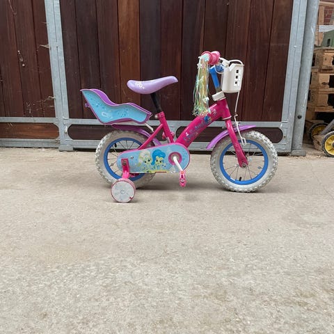 RASK løbecykel med 12" hjul i pink. Cyklen har hvidt styr med greb og hvidlige dæk samt saddel i brunlig farve. Egnet som balancecykel til mindre børn, der skal øve balance og styreteknik før overgang til almindelig cykel.