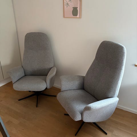 Sælger to dejlige og komfortable lænestole i flot grøn farve. Stole er super behagelige at sidde i og vil pynte i ethvert hjem.