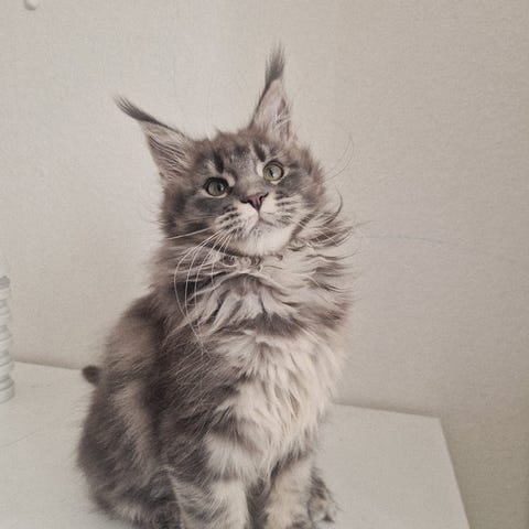 Jeg har en helt unikke killing klar til nyt, kærlige hjem! Hun er 75% Maine Coon, og det kan både ses og mærkes hun er allerede større end almindelige kattekillinger og har mange af racens klassiske træk: store poter, busket hale, silkeblød pels og det karakteristiske træk af en Maine coon