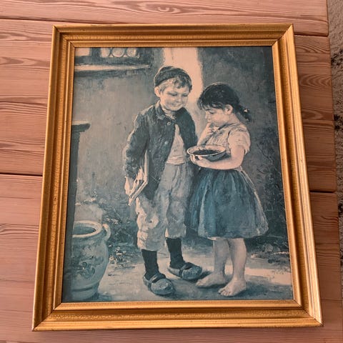 Sæt med 2 indrammede tryk med børnemotiver. Det ene billede viser et barn i en balje med damp omkring, det andet billede viser et barn, der hænger tøj op på en tørresnor. Begge motiver er farvetryk i rammer med glas, én mørk træramme og én smal, dekoreret guldfarvet ramme. Velegnet som vægdekoration i f.eks. børneværelse eller opholdsrum.christel billeder tag begge til prisen