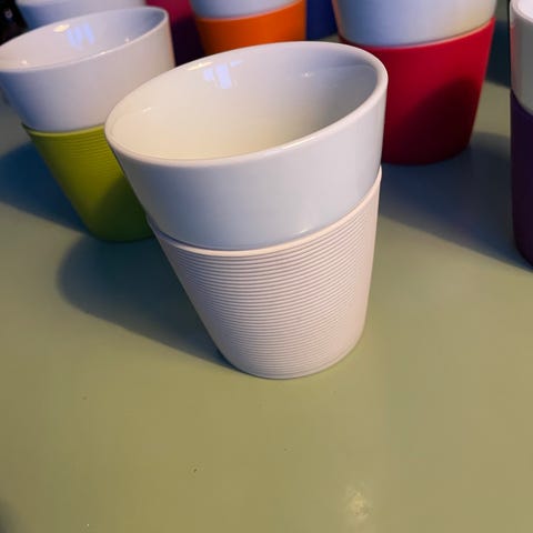 Bodum krus med silikonebånd i hvid og rød. Velegnet til varme drikke som kaffe, te eller kakao. Sælges som sæt med to krus.