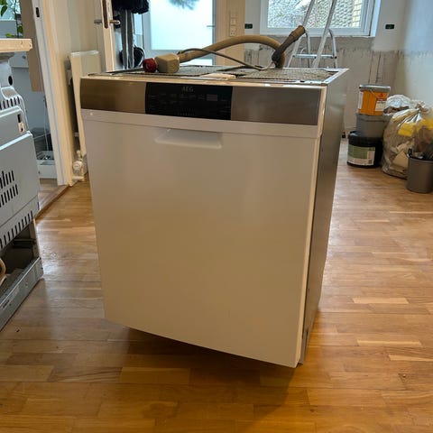 AEG underbygget opvaskemaskine fra 2022. Modellen er beregnet til montering under bordplade i køkken. Fronten fremstår i hvid med betjeningspanel øverst. Maskinen tilsluttes via standard vand- og afløbsslanger samt eltilslutning. Velegnet til fast installation i køkkenelementer, hvor der ønskes en underbygget opvaskeløsning.