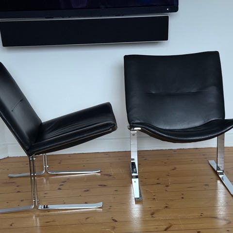 2 YDERST VELHOLDTE LOUNGESTOLE I SORT OKSELÆDER, OG FLOT CHROM STEL . RIGTIG FLOTTE KVALITETS STOLE FRA MÆRKET KEBE .