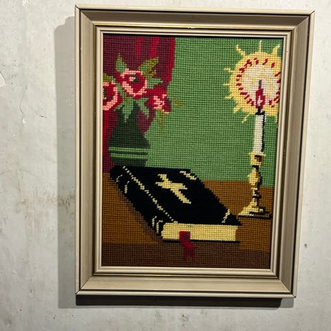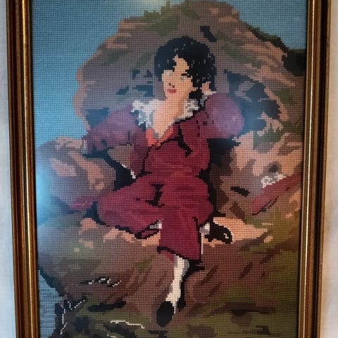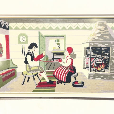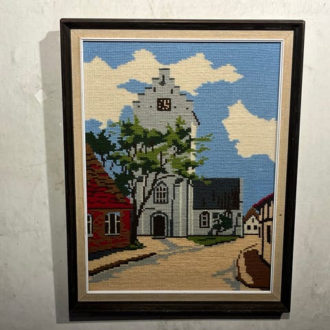 Ældre, håndbroderet billede, sandsynligvis fra 1950'erne eller 1960'erne, der skildrer et hyggeligt motiv. Billedet er udført med korssting / stramajbroderi, monteret i en klassisk træramme med glas. Kunsthåndværk som har været almindelig i danske hjem, men som nu er blevet vintage. Måske kan du bruge selve broderiet til noget kreativt, en taske, en jakke, vest, pude, eller andet krea-projekt.