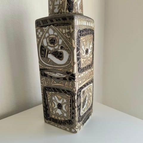 Royal Copenhagen Baca vasen er firkantet med dekorerede overflader og et rustikt udseende. Materialet er keramik.