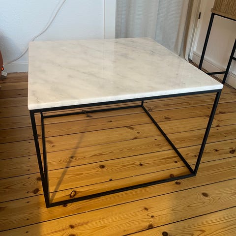 Bordet har en rustik marmorplade med en flot gråligt mønster. Benene er i solidt metal med trælook.,Afhentes i:,Røde Kors Tuborgvej / København NV (101),Bemærk at mail, chat og beskeder ikke besvares, og varen skal købes på knappen "Gå til varen"