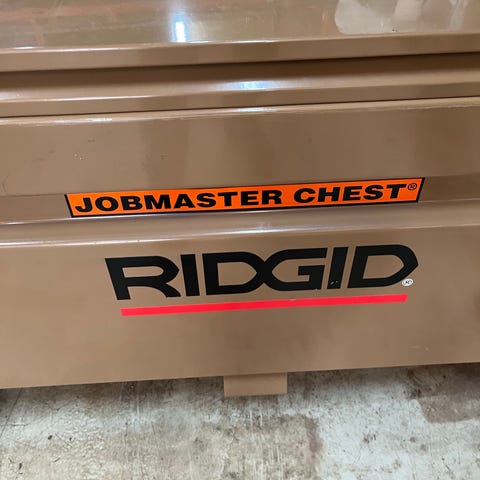 Robust og kraftig værktøjskasse fra RIDGID, model Jobmaster Chest 2472R. Ideel til opbevaring af værktøj og udstyr på værksted eller byggeplads. Monteret med kraftige hjul, hvilket gør den nem at flytte rundt – selv når den er læsset.