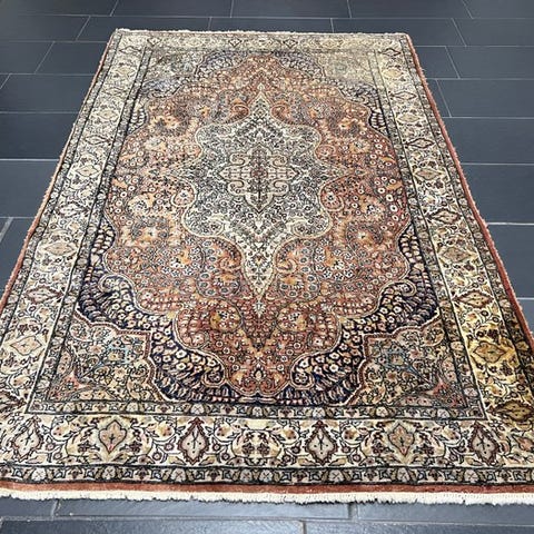 Det fint udarbejdede midtfelt viser et elegant, buet medaillon, der harmonisk er indlejret i et tæt floralt ornamentfelt. Baggrunden er i varme beige-, rosé- og brune nuancer, mens de mørkeblå hjørneindhak giver tæppet dybde og kontrast.