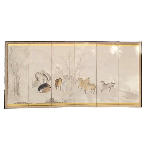 Et sekspanelers byôbu-skærm fra Japan, dateret til anden halvdel af det 19. århundrede (tidlig Meiji), med Kanô-skolens stiliste vinterlandskab malet på gyldent bladgrund og måler 377,8 cm i bredde og 172,6 cm i højden, i fremragende stand med restaureret guldblad og certifikat for ægthed inkluderet. Klik på den blå "gå til varen" knap, for at købe eller byde på denne vare. Den samlede pris vil blive vist inden du afgiver dit bud.