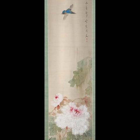 Meget fin sumi-e landskabsmaleri på papir, signeret af Doi Goga (1817–1881), fra det 19. århundrede i Japan, med tomobako, rulleender i træ, målene er 194,5 × 51,5 cm, i god stand. Klik på den blå "gå til varen" knap, for at købe eller byde på denne vare. Den samlede pris vil blive vist inden du afgiver dit bud.