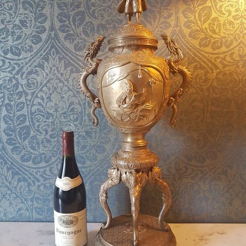 Masiv bronze-skulptur af et dyr der går, elefant med væltet snabel, underskrevet under poten med indhakede kinesiske tegn (Tsunemitsu 常光), cirka 1930, mål 40 cm × 28 cm × 17 cm, ældre patina og generelt meget god stand. Klik på den blå "gå til varen" knap, for at købe eller byde på denne vare. Den samlede pris vil blive vist inden du afgiver dit bud.