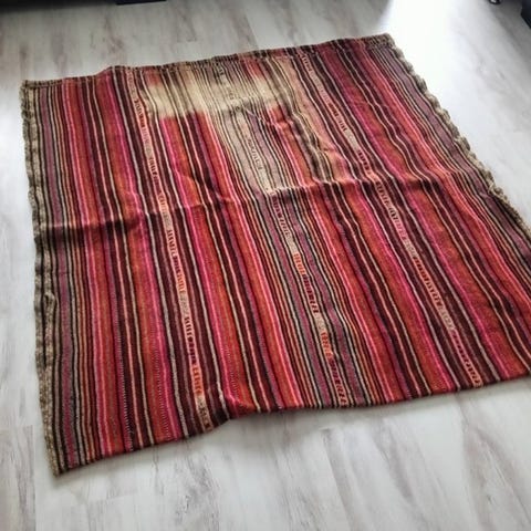 Materiale og farve: Traditionelt fremstillet af uld, med dybrød, orange, mørkeblå og af og til magentafarvet silke kantbånd. De lange frynser forneden er karakteristiske for den nomadiske æstetik.