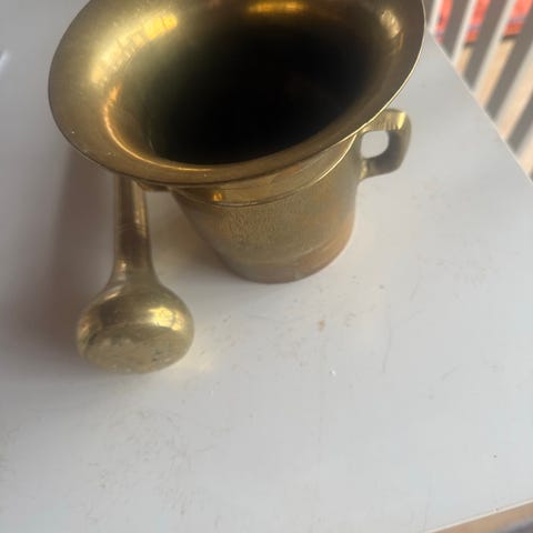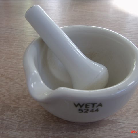 Sjælden, særdeles stor Rosenthal morter med tilhørende Rosenthal støder. Den hvide massivporcelæns morter har en diameter på 29-30 cm. Morteren er egnet til professionel brug i laboratorium eller apotek, men også meget dekorativ i hjemmet eller køkkenet. Kan bruges som f.eks. mikse- eller stor skål. Daterer fra den sene del af det 20. århundrede, anslået til omkring 50 år gammel. På grund af materialets karakter stadig som ny. Nyprisen for en sådan stor professionel morter + støder ligger omkring 700 euro.