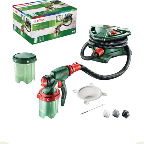 Bosch PFS 3000-2 malersprøjte med 650 W motor. Sprøjtepistol med separat baseenhed og slange til påføring af maling, lak og lignende væsker. Egnet til brug på vægge, træværk og andre overflader, hvor der ønskes jævn fordeling af maling. Leveres i original kasse som på billedet. Har aldrig været åbnet. Jeg mener jeg betalte 1.050 kr, for den.