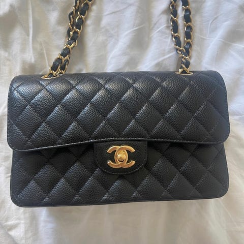 Chanel double flap bag, caviar læder, str. Medium, gold hardware, købt i 2022 - med microchip - som ny med ALT original tilbehør inkl. kvittering (stadig garanti på tasken) entrupy certifikat medfølger. Livs garanti på ægthed.