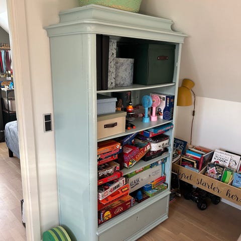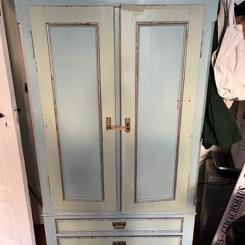 Karlekammerskab. Det er slidt. Det er malet men har nogle skønhedsfejl. Det trænger til en kærlig hånd. Låsen er knækket og skabet har lidt besvær ved at lukke. Jeg lukker det med en snor som også kan ses på et af billederne.