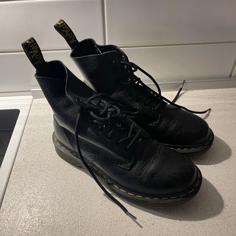 Dr. Martens støvler i str. 37 i sort læder. Klassiske snørestøvler med gul syning langs sålen og strop bagpå skaftet. Overdel i glat læder og kraftig gummisål.