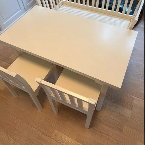 Jollyroom børnebord med stole i grå. Sættet består af et bord med to tilhørende stole i børnestørrelse. Bordet har to låger på bordpladen med udtagelig indsats under den ene låge, som kan bruges til opbevaring af legetøj, tegnesager eller andre småting. Møblerne er velegnede til børneværelse eller legehjørne til aktiviteter som leg, tegning og puslespil.