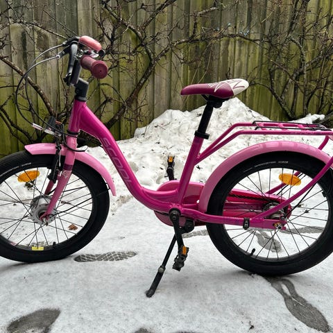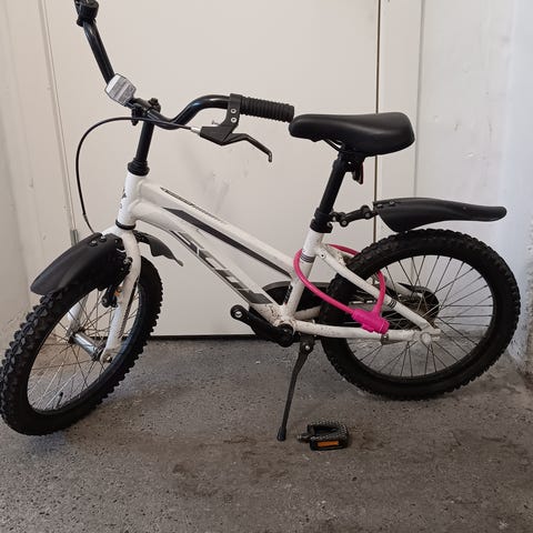 MBK Bella børnecykel med 18" hjul i hvid og lyserød. Cyklen har kurv foran, bagagebærer, kædeskærm og skærme for og bag. Velegnet til børn, der passer en cykel med 18" hjul.