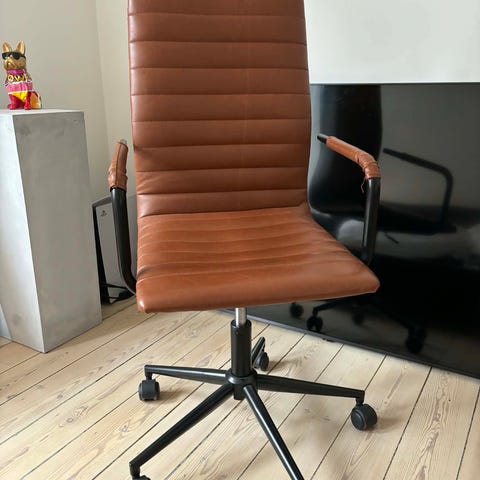 IKEA skrivebordsstol med netryg og polstret sæde i beige. Stolen har fembenet fod med hjul og justerbar sædehøjde. Ryglænet er udført i mesh, som giver ventilation ved brug. Sædet er polstret for øget komfort ved længere tids siddning. Velegnet til brug ved skrivebord eller arbejdsplads i hjemmet. Mål ifølge tegning: sædebredde ca. 46 cm, sædedybde ca. 40 cm, sædehøjde ca. 45–58 cm, samlet bredde ca. 71 cm og samlet højde ca. 86–98 cm.