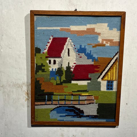 🖼️ Billede broderet stramaj korssting med ramme. Ældre, håndbroderet billede, sandsynligvis fra 1950'erne eller 1960'erne, der skildrer et hyggeligt motiv. Billedet er udført med korssting / stramajbroderi, monteret i en klassisk træramme med glas. Kunsthåndværk som har været almindelig i danske hjem, men som nu er blevet vintage. Måske kan du bruge selve broderiet til noget kreativt, en taske, en jakke, vest, pude, eller andet krea-projekt.