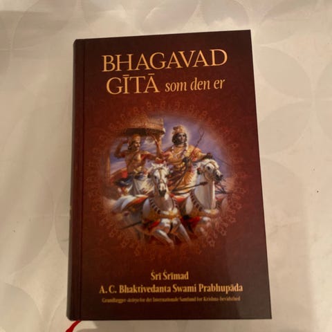 Sammendrag: A masterpiece of scriptural literature, Bhagavad-gītā is a sacred "song" in the form of a battlefield dialogue between the Lord Krsna and Arjuna, his friend and disciple. Krsna, acting as Arjuna's adviser, instructs him in the science of self-realization, teaching him how to live as a devotee of the Lord and to thus reach the eternal spiritual world while continuing to perform his earthly duties. This edition is fully indexed and cross-referenced and is illustrated with forty-four magnificent full-color paintings.