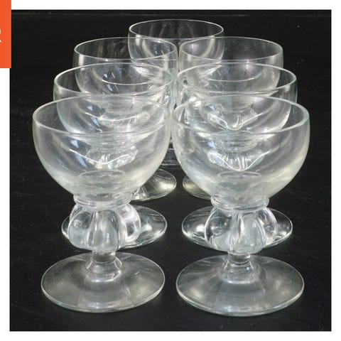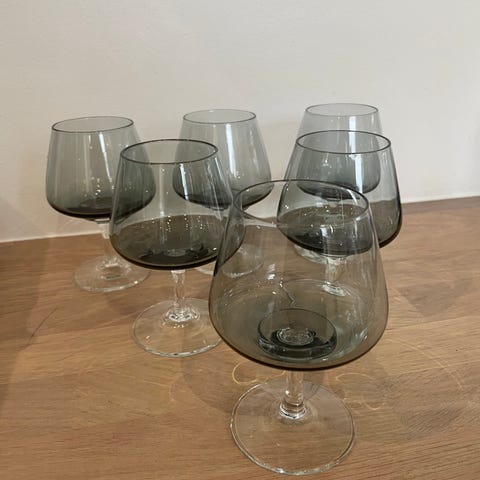 Sæt af seks sorte vinglas med klassisk design. Glassene har en tydelig stilk og fod, hvilket giver dem en elegant udstråling. De ser ud til at være lavet af transparent glas med en mørk toning.